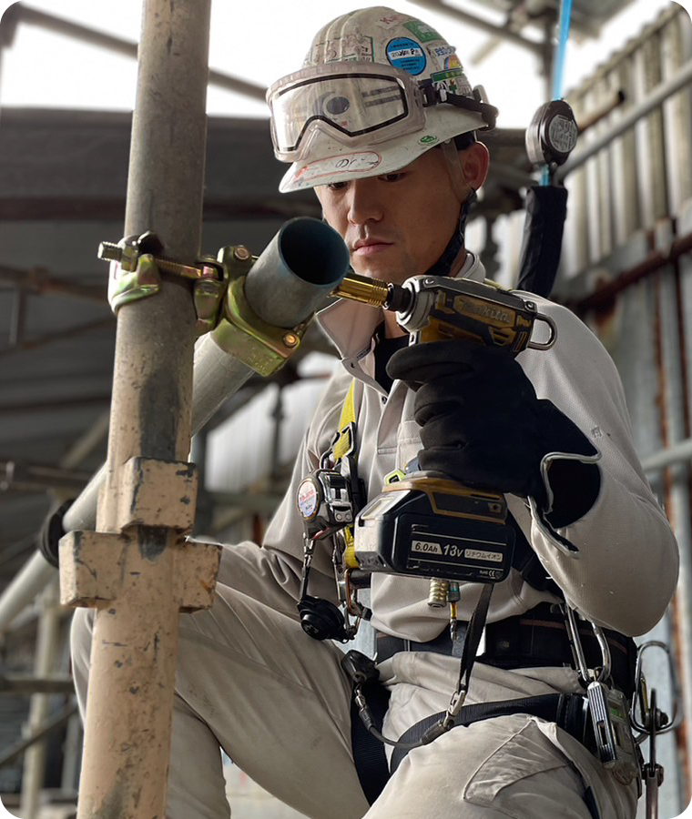 決めた理由は何ですか?建築・土木・プラントに携わる足場工事を行っているのを知り、自らのレベルアップと共にまだまだ知らない事を、先輩たちから勉強したいと思い決めました。また、多種多様の工事が経験出来るところや、業績が安定していたことも入社の決め手となりました。
